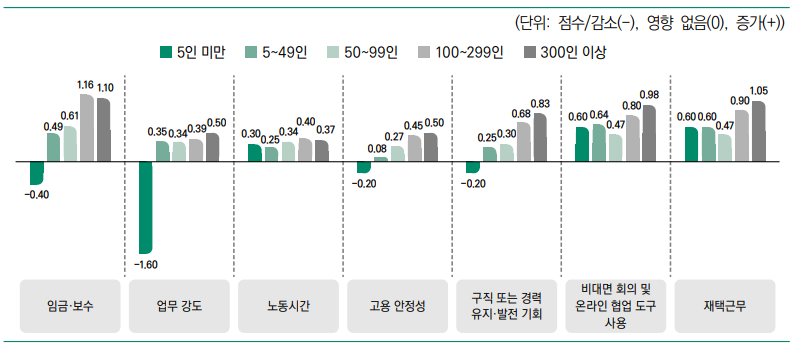 일 자체의 즐거움이나 가치, 창의성과 개성을 발휘할 기회, 적극적인 참여 등의 항목에서는 인식이 다소 부정적으로 변화했지만, 일자리의 안정성이나 수입, 미래 경력 발전의 가능성에 대한 인식에 있어서는 긍정적으로 변화했다.