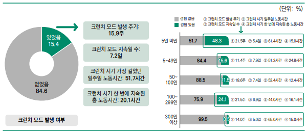 크런치 모드를 경험한 비율은 2019년 60.6%, 2020년 23.7%, 2021년 15.4%로 나타나 감소 경향이다. 크런치 모드가 진행될 때 그 지속일수는 7.2일, 크런치 모드 시기 가장 길었던 일주일 노동시간은 51.7시간, 한 번에 지속된 총 노동시간은 20.1시간으로 나타나 매우 고강도의 집중 초과근무 관행이 여전히 존재한다는 점이 확인됐다.
