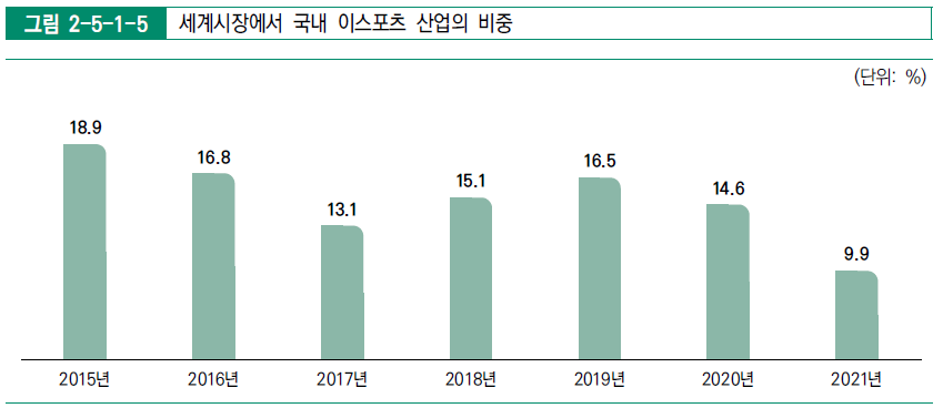 뉴주에 따르면, 세계 e스포츠 산업 규모와 국내 e스포츠 산업 규모를 비교했을 때 확장 산업 규모 기준으로 국내 e스포츠 산업의 세계 시장 비중은 9.9%인 것을 나타났다. 이 역시 전년 대비 감소한 수치다. 4.7% 줄어들었다. 또한, 2015년부터 현재까지 중에 가장 늦은 비중을 기록하기도 했다.