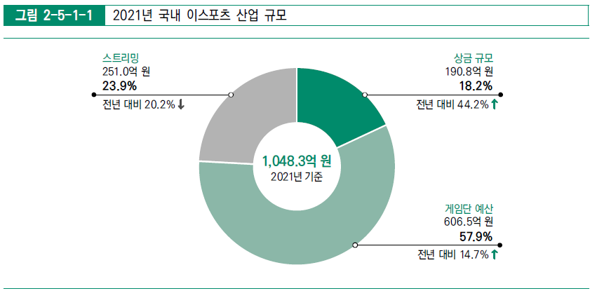 2021년 기준 국내 e스포츠 산업 규모는 약 1,050억 원으로 추산됐다. 이 중에 게임단 예산이 606.5억 원으로 전체 산업 규모의 57.9%를 기록, 가장 비중이 높은 항목으로 나타났다.
