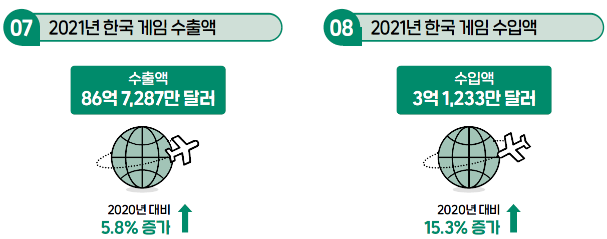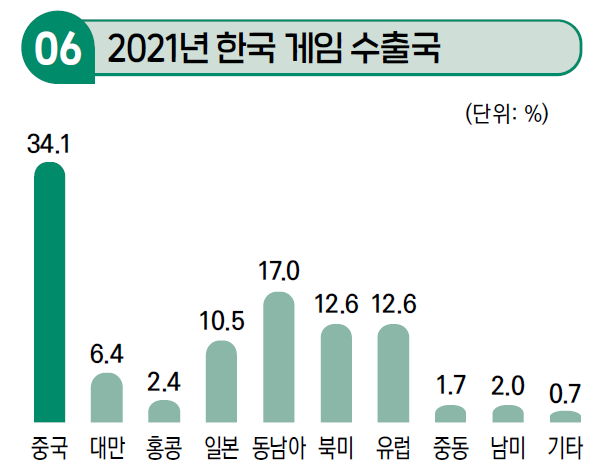 2021년 한국 게임산업 수출액은 전년 대비 5.8% 증가한 86억 7,287만 달러(한화 약 9조 9,254억 원)를 달성하였다. 수출액 비중은 중국(34.1%), 동남아(17.0%), 북미와 유럽(각 12.6%), 일본(10.5%) 순서로 나타났다. 수입액은 15.3% 증가한 3억 1,233만 달러(한화 약 3,574억 원)로 최근 7개년 중 가장 많은 것으로 집계되었다. 전년 대비 중국 수출액은 소폭 감소하였으나, 동남아, 유럽, 북미 등에 대한 수출 비중이 늘어나며 수출 다변화의 성과가 일부 나타난 것으로 보인다.