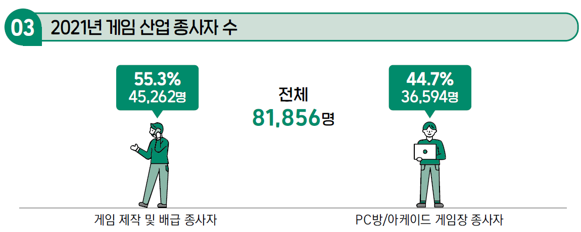 2021년 국내 게임 산업 종사자 수는 총 81,856명으로 파악되었다. 게임 제작 및 배급업 종사자 수는 45,262명(55.3%), 게임 유통업 종사자 수는 36,594명(44.7%)이며, 지난 2020년에 이어 게임 제작 및 배급업 종사자 수가 유통업 종사자 수보다 많은 것으로 나타났다.