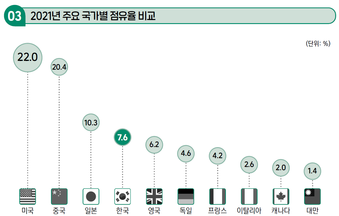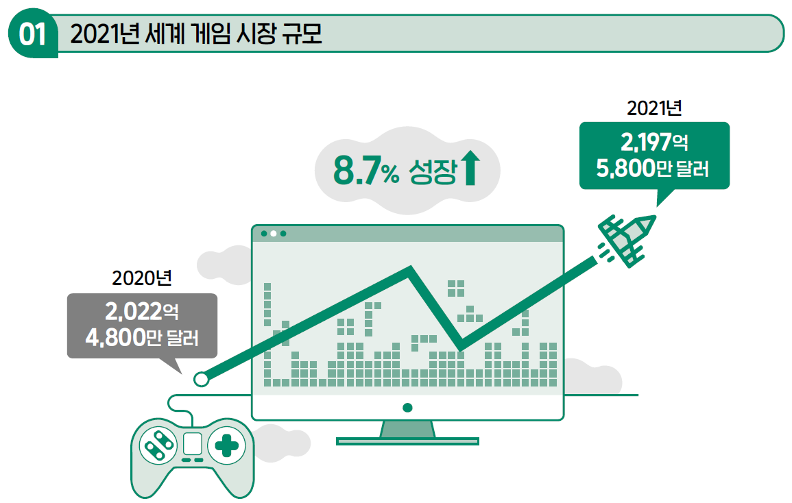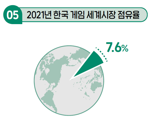 2021년 세계 게임시장 규모는 전년 대비 8.7% 증가한 2,197억 5,800만 달러로 나타났다. 세계 시장에서 한국의 점유율은 7.6%로, 미국(22.0%), 중국(20.4%), 일본(10.3%)에 이어 전년과 동일한 4위를 기록하였다. 점유율은 6.9%에서 7.6%로 0.7%p 상승하며 전년보다 3위와의 격차를 좁혔다. 플랫폼별로 살펴보면, PC게임의 점유율은 13.2%로 중국, 미국에 이어 3위를, 모바일 게임의 점유율은 10.6%로 중국, 미국, 일본에 이어 4위를 차지하였다.