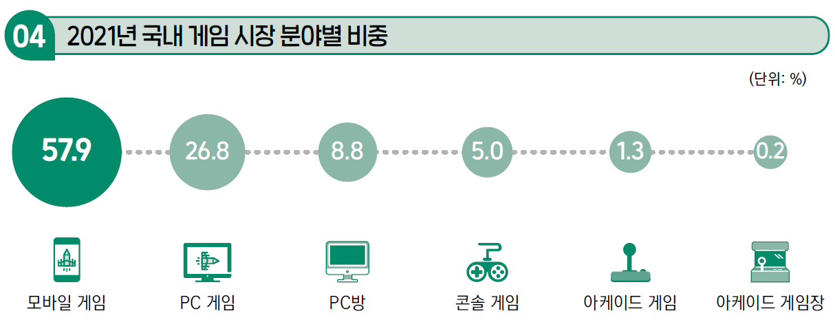 2021년 모바일 게임 매출액은 12조 1,483억 원으로 전체 게임산업 매출액의 57.9%를 차지했다. 이어 PC게임 매출액은 5조 6,373억 원(점유율 26.8%), 콘솔게임 매출액은 1조 520억 원(점유율 5.0%), 아케이드 게임 매출액은 2,733억 원(점유율 1.3%)을 각각 기록했다.
