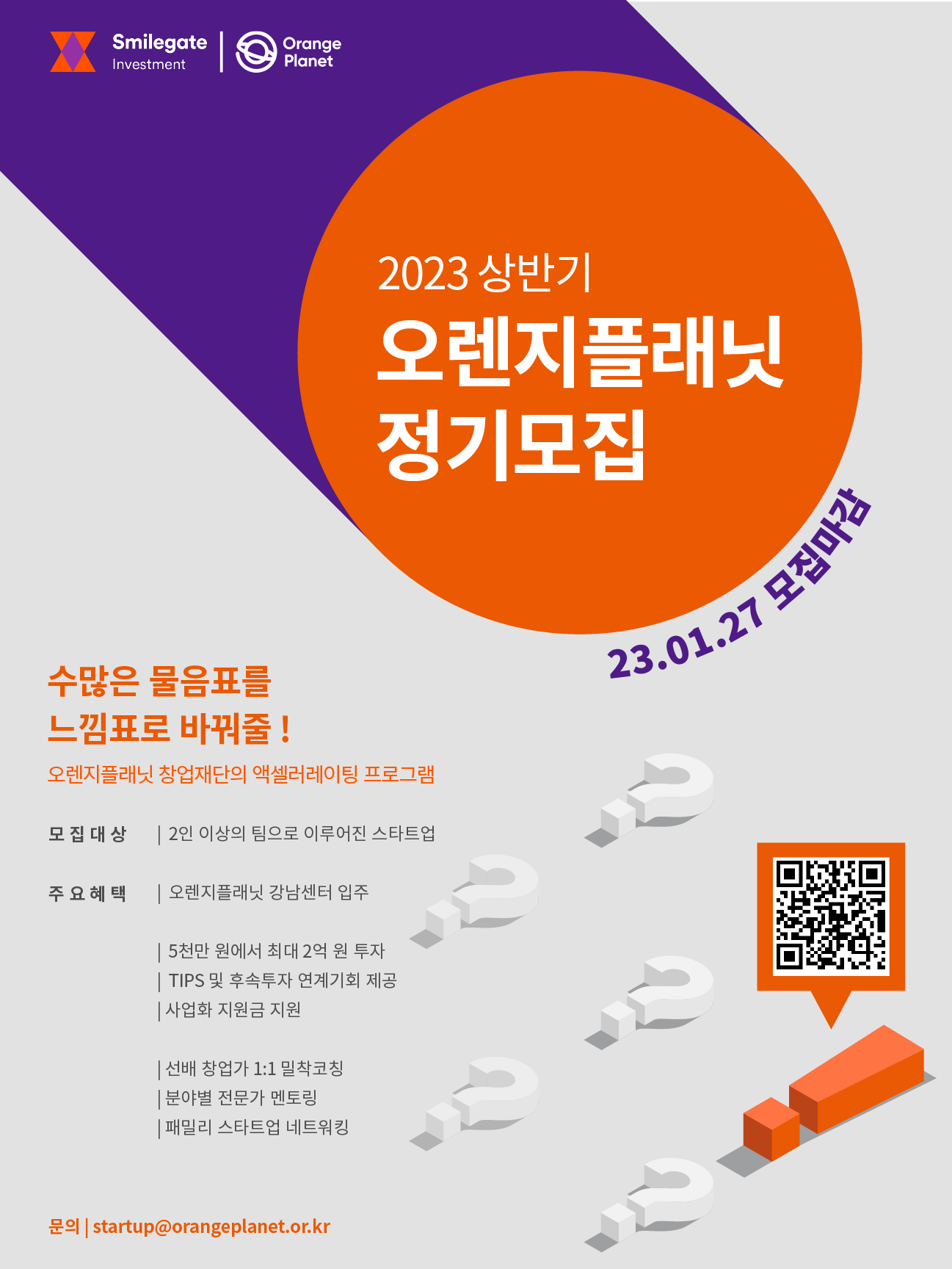 (재)오렌지플래닛 창업재단(센터장 서상봉, 이하 ‘오렌지플래닛’)은 ‘2023년 상반기 정기모집'(이하 ‘정기모집’)을 실시한다고 2일(월) 밝혔다.