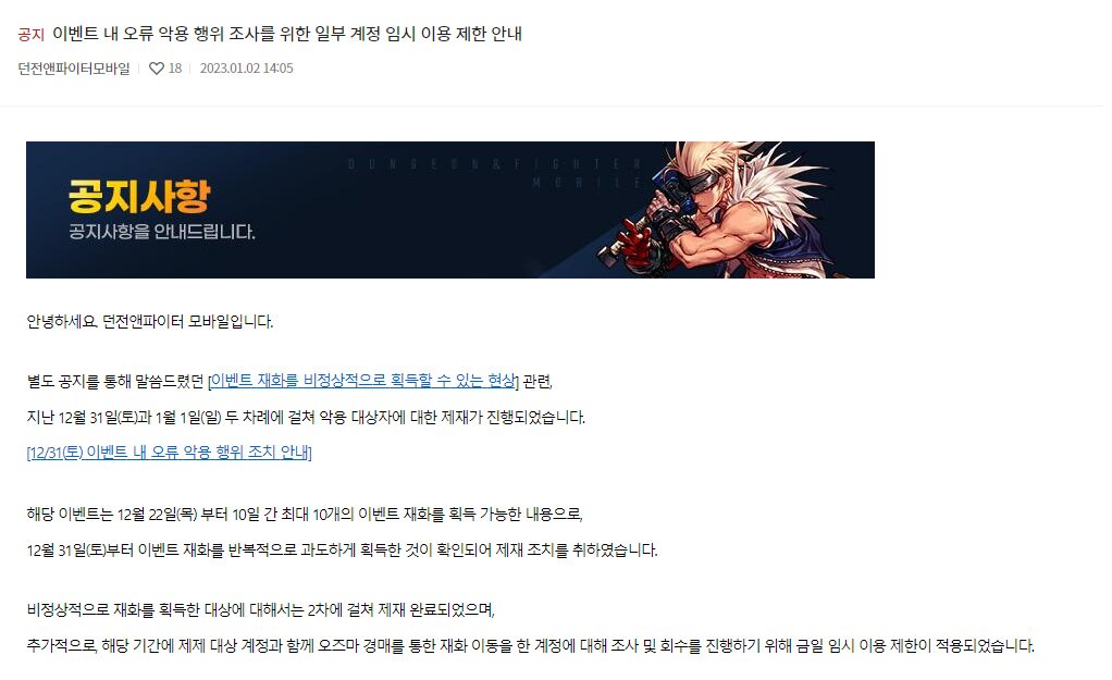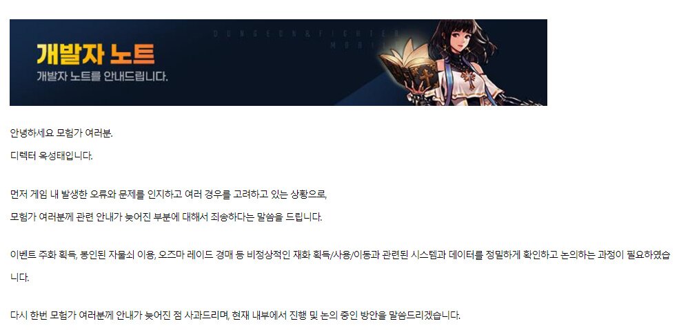 던전앤파이터 모바일이 지난 12월 말부터 이벤트를 진행하는 중 재화 버그와 핵 사용 관련 이슈가 불거졌다.