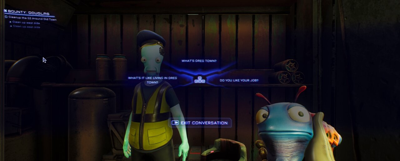어찌보면 상당히 흔한 전개에서, 개발사 특유의 저질스러운 농담과 말장난, 그리고 유머 감각이 빛을 발합니다. 케니를 비롯한 말하는 총 종족, ‘개틀리언’은 게임을 진행하는 동안 쉬지 않고 떠들어대기 일쑤이며, 여러 장소를 탐험하며 만나는 외계인들도 저마다 나사가 하나씩 빠져 있는 상태입니다. 또 가끔은 비디오게임의 클리셰같은 요소들(어린 아이 npc를 쏠 수 없다 등)을 비꼬는 듯한 연출 등도 곳곳에서 볼 수 있기에 유머 취향이 비슷하다면 한 없이 웃으며 플레이가 가능할 것입니다.