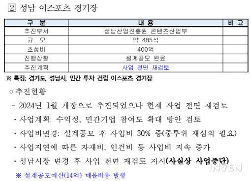 민선 8기가 되며 성남시장으로 국민의힘 신상진 전 국회의원이 당선됐다. e스포츠 경기장은 설계공모까지 완료된 상태였다. 신상진 시장은 수익성, 민간기업 참여도 확대 방안 등을 지시하며 사업을 다시 살폈고, 이후 전면 재검토 지시를 내린 것으로 알려졌다.