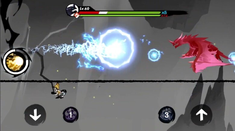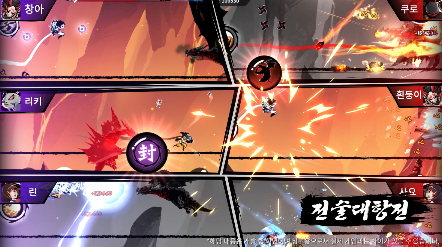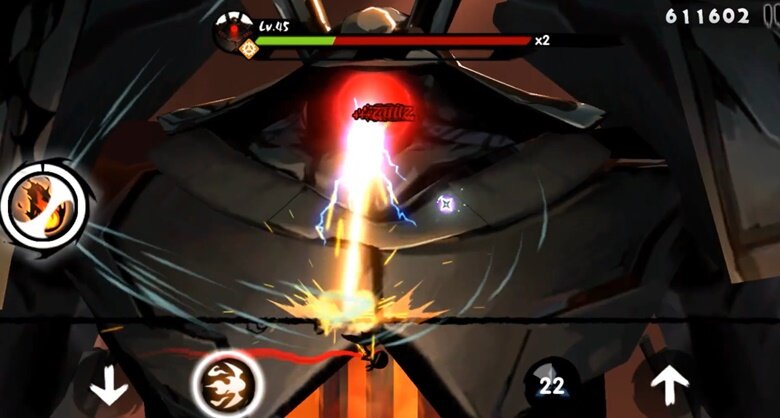별개로, 일회성 즉발 아이템 형태의 수리검, 그리고 각 캐릭터의 오의가 존재합니다. 오의는 코인을 먹거나 적을 격파하는 등 점수를 얻을 때마다 충전되며, 보스전 시 강력한 피해를 줄 수 있는 한편 위기 탈출을 위한 필살기로 사용할 수도 있죠. 주인공이라 할 수 있는 화염 속성 닌자 ‘쿠로’의 경우 일정 시간 자동으로 주변 적들을 하나씩 공격하는 ‘화룡 화염탄’을, 물속성 닌자인 ‘린’은 피해량은 다소 약하지만 화면 전체의 적을 일정 시간 공격하는 ‘죽음의 서리’를 사용합니다.