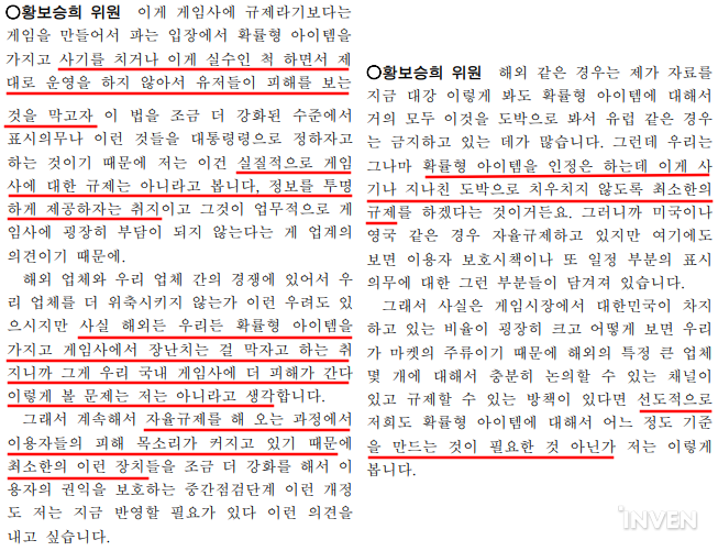 황보승희 의원은 해당 규제안이 사기성, 고의성을 막는 게 목적이기에 해외 게임사와의 역차별 문제를 우려하는 건 적절하지 않다고 주장했다. 이어 해외 사례를 따라가긴 보단 우리나라가 선도적으로 만드는 것도 방법이라고 전했다.