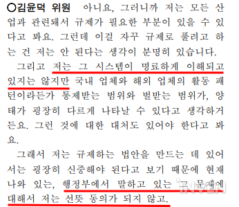회의록으로 확인되는 것은 김윤덕 의원이 스스로 확률형 아이템 이슈에 대한 이해가 부족하다고 전제하는 부분이다. 김윤덕 의원이 언급한 ‘시스템’은 확률형 아이템 이슈로 해석된다. 이어 김윤덕 의원은 “행정부에서 말하고 있는 문제에 대해 동의가 되지 않는다”라고 말하는데, 이는 앞서 전병극 문화체육관광부 차관이 “자율규제가 가장 이상적이지만, 현실 시장에서 작동은 잘되지 않으므로 일부 범위를 정해서 확률형 게임을 규제하자는 취지도 있다”라 설명한 부분으로 이해된다.