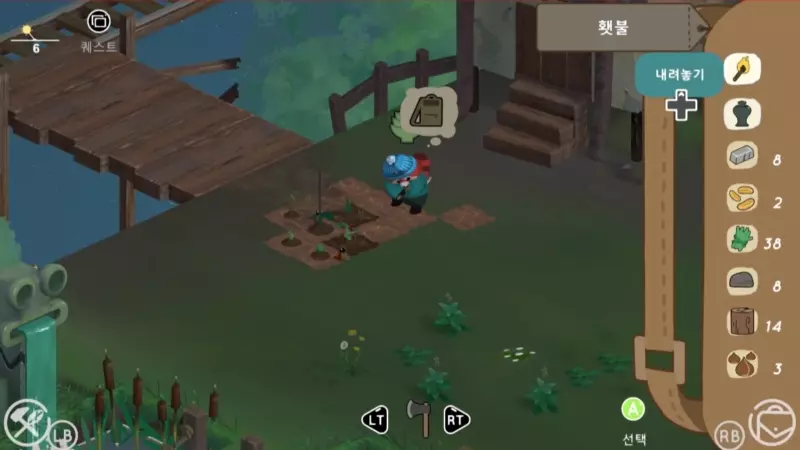 그러다가 점차 어떤 맥락 없이 그저 돌아다니면서 차근차근 이야기를 풀어가고, 섬을 가꾸는 그 루틴이 자연스럽게 체화가 되기 시작한다. 어쨌거나 정원도 있고, 밧줄이나 이런저런 걸 만드는 튜토리얼을 거치면서 무언가 할 수 있다는 단서는 있으니 그걸 하나하나 가닥을 잡아가며 엉킨 실타래를 풀어가는 셈이다. 그래서 처음에는 검밖에 없지만 나중에는 도끼와 곡괭이가 생기고, 그걸로 밭도 일구고 때로는 먹을 것도 나누어주는 정원 라이프가 점차 완성이 된다.