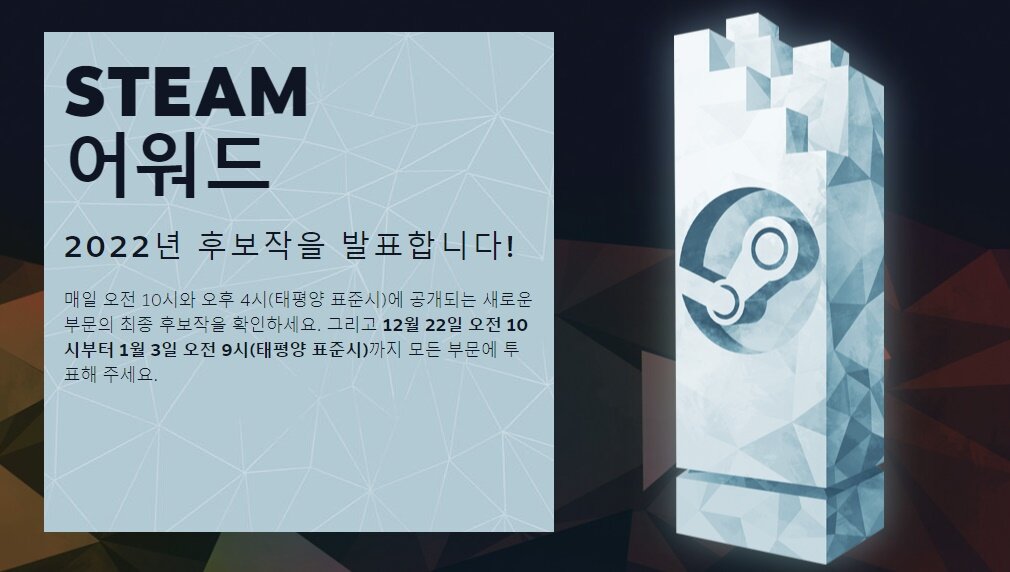 유저들이 직접 스팀 올해의 게임(Game of the Year, 이하 GOTY)을 선정하는 ‘스팀 어워드 2022’의 시간이 돌아왔다. 현재까지 공개된 게임은 8개 부문, 40개에 달한다. 아직 공개되지 않은 부문과 게임들이 있는 만큼, 22일 오전 10시부터 시작되는 투표에서는 더 많은 게임들이 후보작들에 오를 것으로 예상된다.