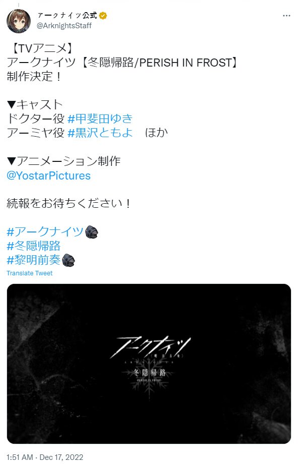 요스타는 오늘(17일), 명일방주 공식 트위터를 통해 애니메이션 시즌2의 티저를 공개했다. 시즌1 ‘여명의 전주곡’에 이어 다음 시즌의 제목은 ‘서리 속의 죽음’으로, 티저에서 화면이 서리가 끼는 효과를 통해 원작의 보스 캐릭터 중 한 명인 ‘프로스트노바’의 등장을 암시했다. 제작은 이전 시즌과 마찬가지로 요스타 산하의 애니메이션 스튜디오이자 요스타가 퍼블리싱하는 모든 게임의 애니메이션 PV를 도맡아온 요스타 픽처스가 맡는다.
