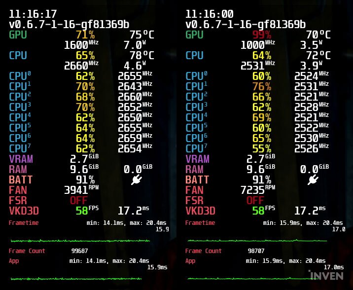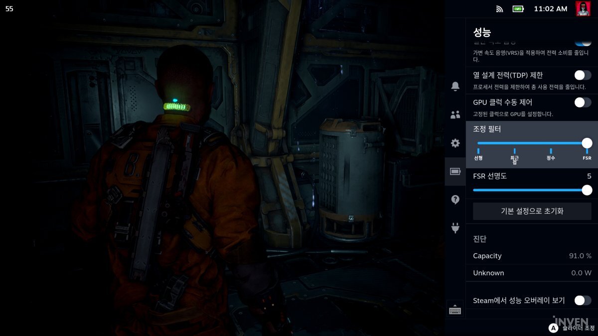 이러한 설정은 별도의 외부 앱 없이 스팀 덱이 기본적으로 제공하는 성능 오버레이를 통해 쉽게 확인할 수 있다. 프레임부터 전력 소모, 램, V램 소모량 역시 확인할 수 있다.