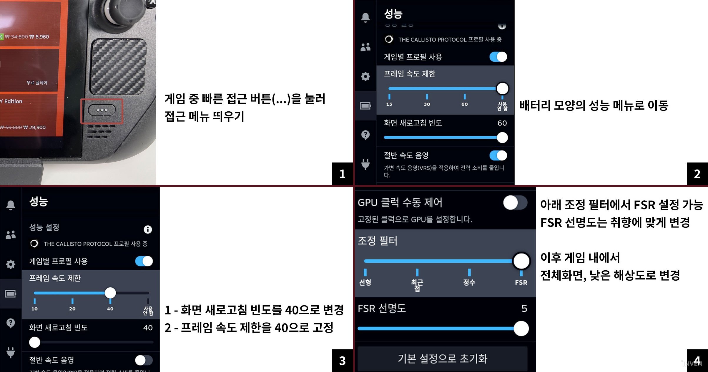 스팀 덱에서도 고사양 게임은 옵션 타협을 해도 고정 60fps를 맞추기는 어렵지만, 40fps는 많은 게임이 고정 가능하다. 물론 60fps가 중요한 게임이라면 60fps로 고정하는 것 역시 가능하다. 이러한 설정은 빠른 접근(스팀 덱 오른쪽 아래 …버튼)으로 바로 들어갈 수 있다.