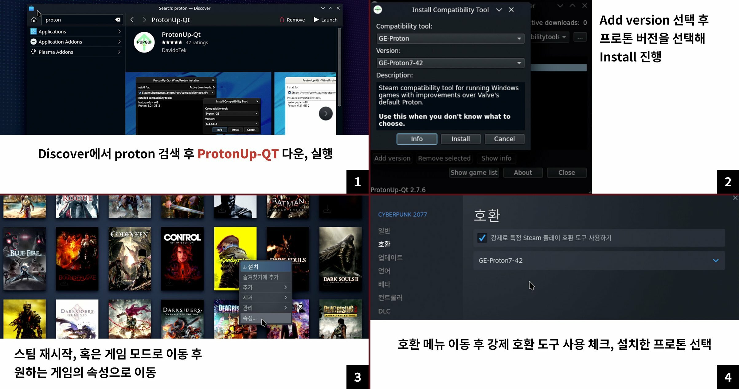 프로톤 GE 설치는 디스커버를 통해 이루어지며, 설치 이후 게임 실행 전 설정을 통해 설치한 프로톤 GE 버전을 호환성 도구로 선택해야 한다.