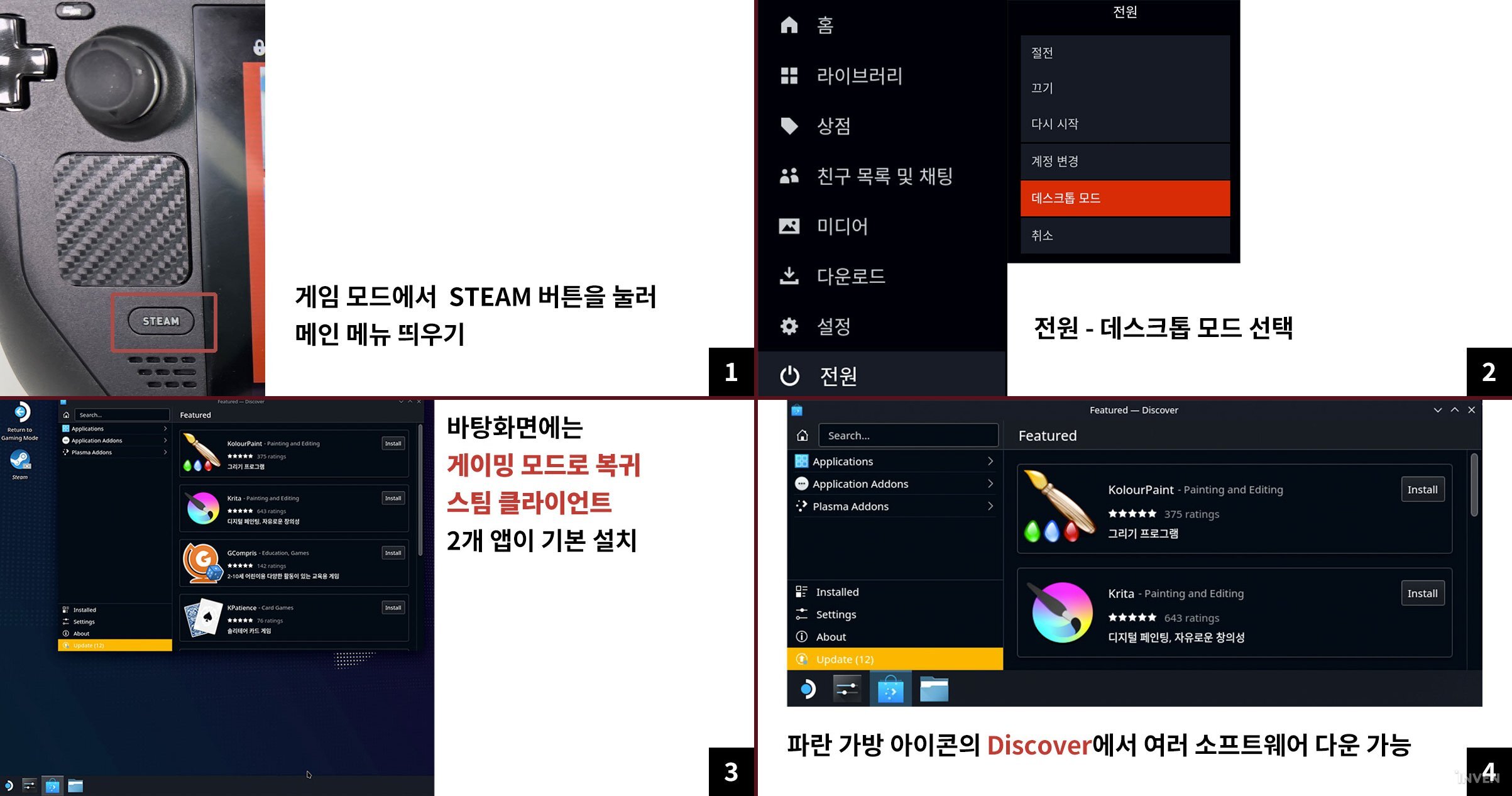 비 스팀 게임의 스팀 앱 등록, 플러그인 설치, 멀티미디어 기능 활용 등 다양한 설정과 앱 활용이 여기서 가능하다. 윈도우 MS 스토어와 유사한 소프트웨어 센터인 디스커버(Discover)를 통해 PS 리모트, Xbox 게임 패스 기능 설정, Plex나 스포티파이, 애플 뮤직 등의 서드파티 앱 설치로 스팀 덱의 활용도를 높일 수도 있다. 한국어 패치 같은 경우도 가능하다.