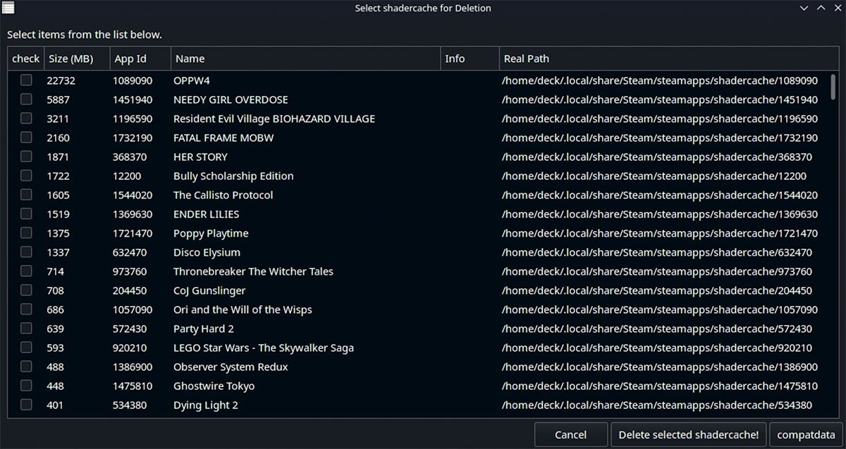 이러한 파일들은 스팀 덱에서 찾기 귀찮은 경로에, 이름 대신 번호 폴더로 저장된다. 일반적인 방법으로는 삭제가 꽤 번거로운데 콘솔을 통해 설치하는 앱을 통해 직접 확인해 이를 제거할 수 있다.