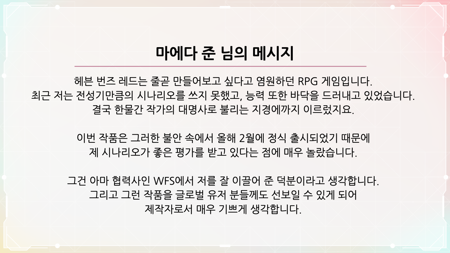 개인적으로 한국에서 서비스하게 된 다는 것에 대해 특히 더 감격스러운 마음이다. 한국의 드라마나 영화는 훌륭한 스토리성을 세계에 인정받고 있는데, 그러한 한국에서 일본의 헤븐 번즈 레드를 출시하게 된 것이 감격스럽다. 한국 유저들의 목소리를 더욱 가까이에서 들으면서 운영하고 싶은 마음이다.