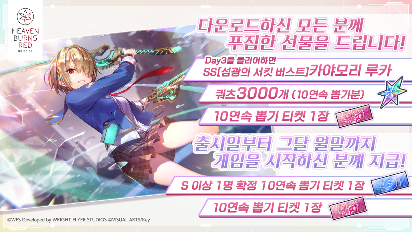 출시 시점이 되면 사전예약자에게 알람이 전달되며, 게임을 실행한 유저에게는 쿼츠 3,000개와 10연속 가챠, 데이3까지 플레이한 유저에게는 SS등급의 ‘카야모리 루카’가 지급될 예정이다. 카키누마 프로듀서는 출시 후 월말까지 게임을 플레이한 유저에게 S이상 확정이 포함된 10연속 뽑기 티켓 등 여러 보상이 제공될 예정이니 ‘헤븐 번즈 레드’에 관심이 있는 유저라면 출시 시점부터 빠르게 시작하길 바란다고 당부했다.