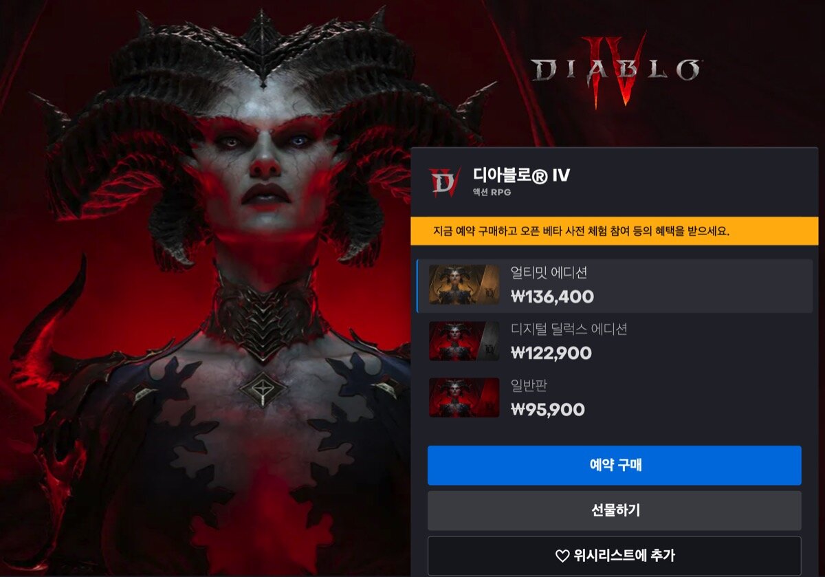디아블로4는 다가오는 2023년 6월 6일 PC, PS4, PS5, Xbox One, Xbox Seires X|S로 출시될 예정이며, 사전 예약 구매자에게는 베타 버전의 얼리 액세스 권한이 주어질 예정이다. 디아블로4의 국내 예약 판매 가는 일반판 95,900원, 디지털 디럭스 122,900원, 얼티밋 에디션 136,400원으로 책정됐다.