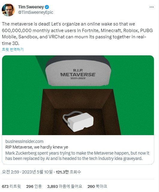 지난 5월 8일, 미국의 경제 전문지 인사이더가 게재한 ‘RIP 메타버스’라는 자극적인 제목의 칼럼이 공개된 뒤, 에픽게임즈 팀 스위니 CEO가 메타버스는 죽지 않았으며, 지금도 건재하다는 반응을 전했다.