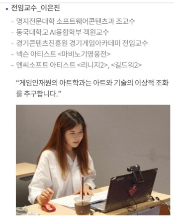 이은진 교수는 한국게임학회(학회장 위정현) 임원이다. 학회 문화예술분과위원장을 맡고 있다. 엔씨소프트와 넥슨, 한국콘텐츠진흥원 게임인재원에서 근무한 경험이 있다. ‘리니지2’, ‘길드워2’, ‘마비노기 영웅전’ 등 게임 개발에 참여했다. 현재 학교에서 게임개발자를 희망하는 학생을 가르친다.
