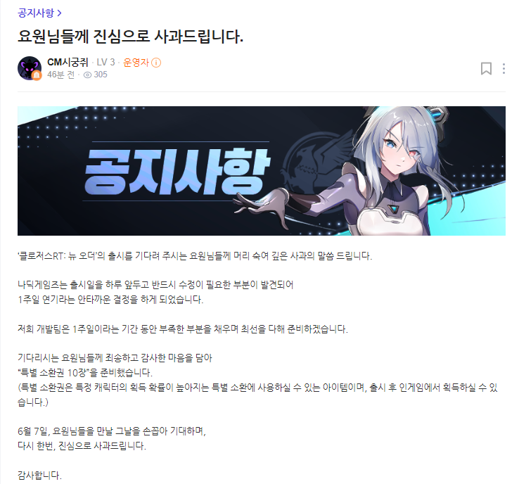 나딕게임즈는 오늘(30일), 공식 라운지를 통해 클로저스 RT: 뉴 오더의 출시일을 6월 7일로 연기한다고 밝혔다.
