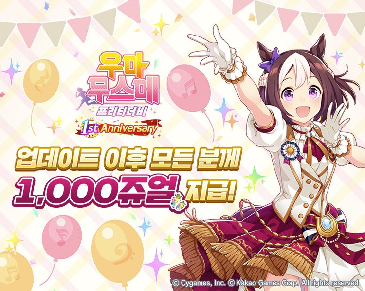 6월 2일(금) 우마무스메 프리티 더비 공식 카페를 통해 1주년 사전예약 안내 공지가 올라왔다. 1st Anniversary 타이틀을 붙인 이번 1주년 이벤트는 신규 시나리오 공개와 더불어 카운트 다운 이벤트, 한정 미션 캠페인 등 무료 쥬얼을 얻을 기회가 많다.