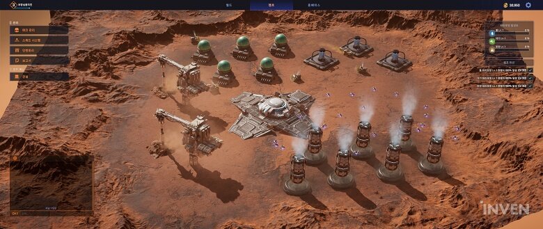 초반 간단한 메크 부대 운용 튜토리얼을 마치고 나면 4곳의 지역 중 한 곳을 선택해 캠프를 건설하게 됩니다. 이곳에서 플레이어는 메크를 생산 및 부대 편성할 수 있으며, 채굴, 워터 펌프, 대기 정화, 토양 개조 4개의 건물을 지어서 관련 자원을 채집할 수 있습니다.