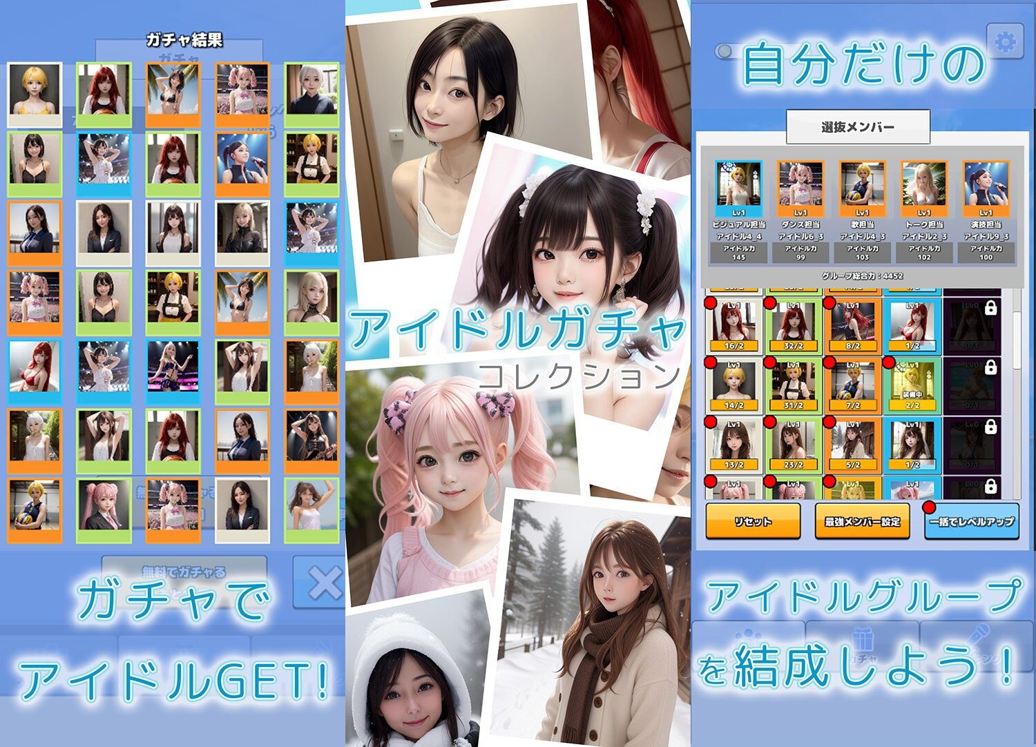 ‘아이돌 가챠 컬렉션’은 아이돌 캐릭터를 뽑고 육성해서 다른 유저와 겨룬다는 지극히 교과서적인 육성 시뮬레이션 게임이다. 다만, 한 가지 다른 게임들과는 사뭇 다른 점이 있다. 게임에 등장하는 모든 캐릭터의 일러스트를 비롯해 대사와 스토어 설명문까지 전부 AI의 도움을 받았다는 점이다. 공개된 정보에 따르면 출시 시점에서는 5개 등급으로 구분된 총 20명의 아이돌 캐릭터가 등장할 예정이다. 등급별로 각기 다른 일러스트가 쓰이는 만큼, 최소 100종류의 일러스트가 그림 AI를 통해 만들어졌다고 할 수 있다.