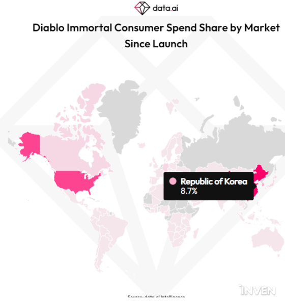 data.ai는 ‘디아블로 이모탈’ 매출 37%(약 2,490억 원)가 중국에서 발생했다고 추정했다. 미국에서 매출은 24.4%(약 1,642억 원)이다. 우리나라는 8.7%(약 585억 원)로 집계됐다.