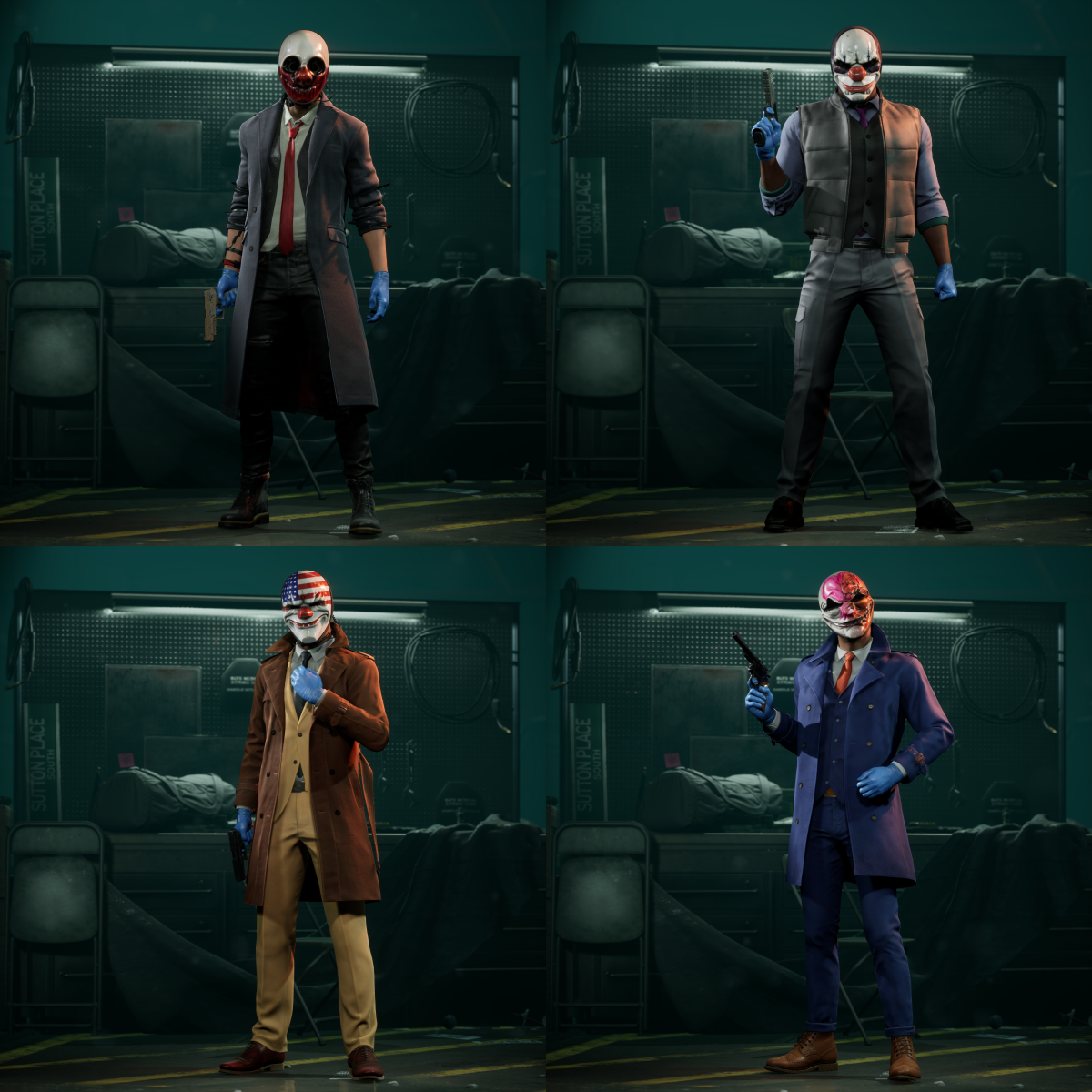 먼저, ‘페이데이2’의 마지막 스토리에 따라 백악관 습격 이후 은퇴를 이뤄낸 4명의 오리지널 주인공이 등장한다. 혹스톤과 체인스, 달라스, 울프는 저마다 아이코닉한 마스크와 기본 옷차림을 가지고 있으며, 출시 초기에는 여기에 더해 두 명의 신규 캐릭터가 추가된 6명의 캐릭터를 선보일 전망이다.