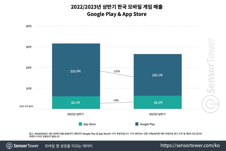 18일 센서타워에 따르면 올해 상반기 모바일 게임 총매출액은 27억 달러(약 3.4조 원)로 전년 동기 32억 달러(약 4조 원)에서 16% 감소했다. 안드로이드에서 21% 감소한 반면 iOS에선 5% 올라 일부 상쇄됐다. 같은 기간 다운로드 수는 2.2억 건으로 전년 동기 대비 18% 감소했다.