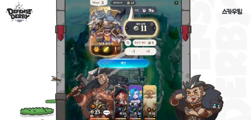 디펜스 더비의 가장 큰 특징은 스카우팅 시스템을 통한 수 싸움과 배치에 따라 달라지는 다양한 시너지 효과다. 플레이어는 매 웨이브 시작 전 캐슬을 방어할 카드를 입수해야 한다. 이를 위해 4명의 유저가 실시간으로 스카우팅을 진행하는데, 입찰 제한 시간 내 보유한 더비 칩 내에서 입찰을 진행하고 가장 많은 더비 칩을 제안한 플레이어가 해당 카드를 획득하는 방식이다.