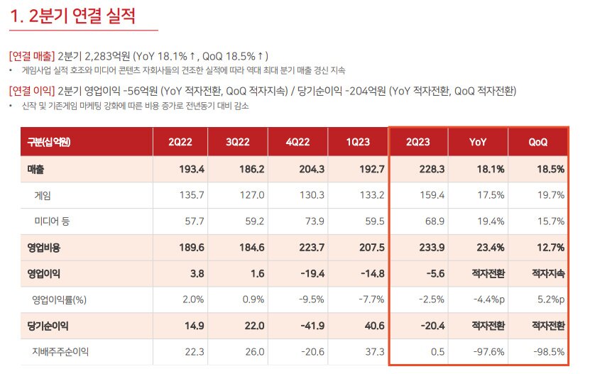 2분기 적자폭이 축소되었는데 3분기부터 흑자 전환을 기대해도 될까. 이익 개선이 된다면 게임 사업과 미디어 각각에서 어떤 주요 요인을 기대해볼 수 있을까.