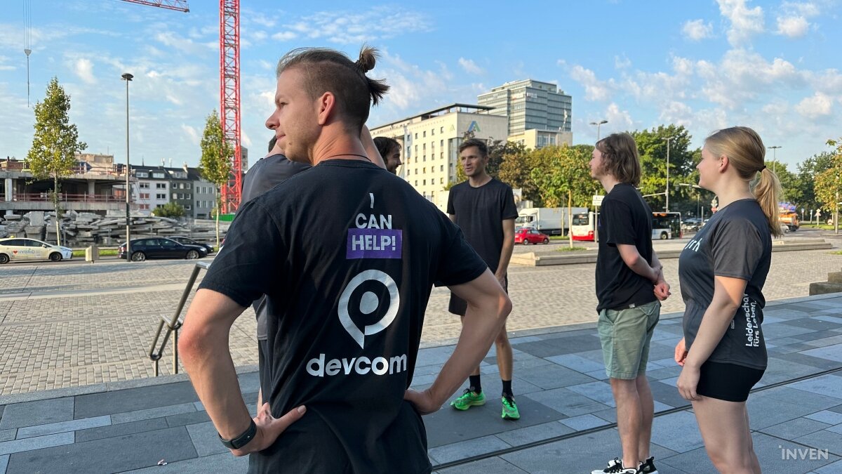 21일 오전 7시 50분쯤이 되자 쾰른메쎄역 앞에 사람들이 모이기 시작했습니다. 데브컴 티셔츠를 입고 있어서 쉽게 찾을 수 있었는데요. 대부분 반팔에 반바지, 조깅용 운동화 등 가벼운 옷차림으로 모였습니다. 서로 대화하는 걸 들어보니 대부분 아는 사이가 아닌, 순전히 조깅하기 위해 모였더라고요. 어느 나라에서 왔냐, 무슨 일을 하냐 등의 대화가 얘기가 오갔습니다. 그리고 8시 정각이 되자 개발자들은 가볍게 스트레칭하고서 뛰었습니다.