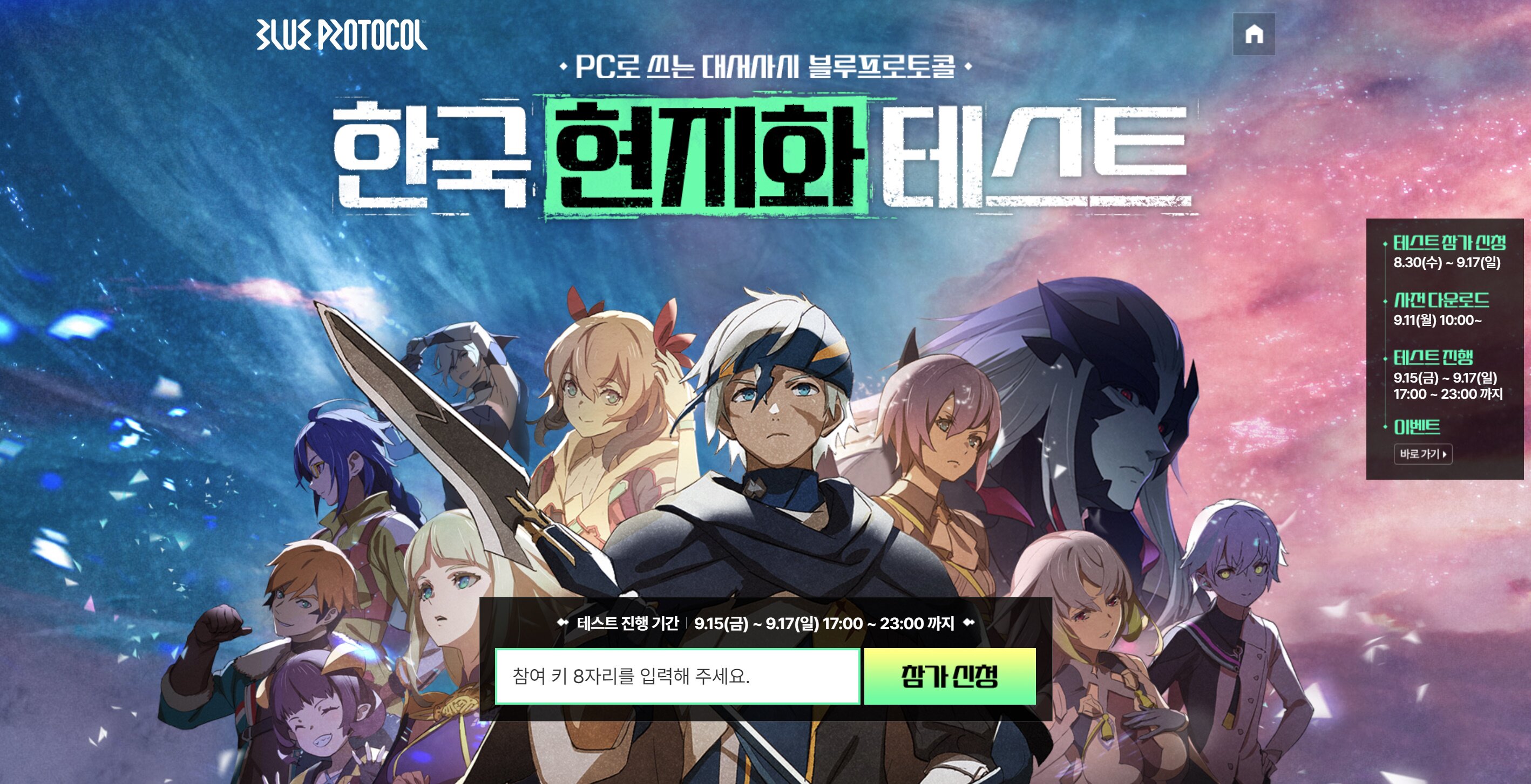이번 테스트는 블루프로토콜의 정식 서비스 전 한국어 현지화 체크 및 한국 유저들에게 안정적인 게임플레이 환경을 제공하기 위한 것으로, 오는 9월 15일부터 9월 17일까지 3일 동안 매일 17시~23시에 서버가 오픈된다. 테스트 참가를 원하는 유저는 공식 카카오톡 채널을 방문한 뒤 테스트 안내 버튼을 선택, 참여 키를 발급받고 공식 홈페이지 테스트 안내 페이지에 해당 키를 입력하면 된다.