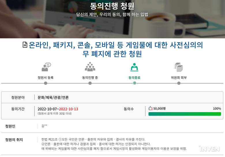 국회 국민동의청원 제도는 5만 명의 동의가 있을 경우 관련 상임위원회가 논의하기로 되어 있다. 이 청원은 문화체육관광위원회가 맡았다. 문체위는 국회법에 따라 150일 이내에 청원 심사를 마쳐야 했다.