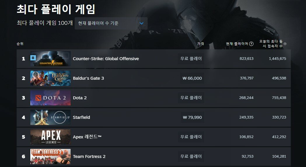 베데스다 게임 스튜디오에서 개발한 오픈 월드 액션 RPG ‘스타필드’가 스팀 동시 접속자 기록 33만 명을 기록했다. 11일 오후 2시 기준 스타필드는 동시 접속자 수 17만 명으로 ‘스팀 최다 플레이 게임’ 순위 4위로 순항 중이다.