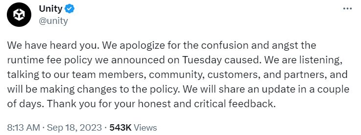 유니티는 오늘(18일), 공식 트위터를 통해서 최근 불거진 요금제 변경 논란과 관련해 사과하고, 정책 변경을 예고했다.