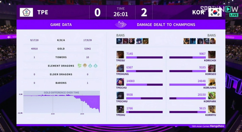 대한민국 LoL 대표팀은 29일 중국 항저우 e스포츠 센터에서 진행된 ‘제19회 항저우 아시안게임’ 금메달 결정전에서 대만을 2:0으로 압도하고, 전승 우승을 차지했다. 5년 전 시범 종목으로 열렸던 자카르타-팔렘방 아시안게임의 아쉬움을 완전히 씻어 내는 완벽한 금메달이었다.