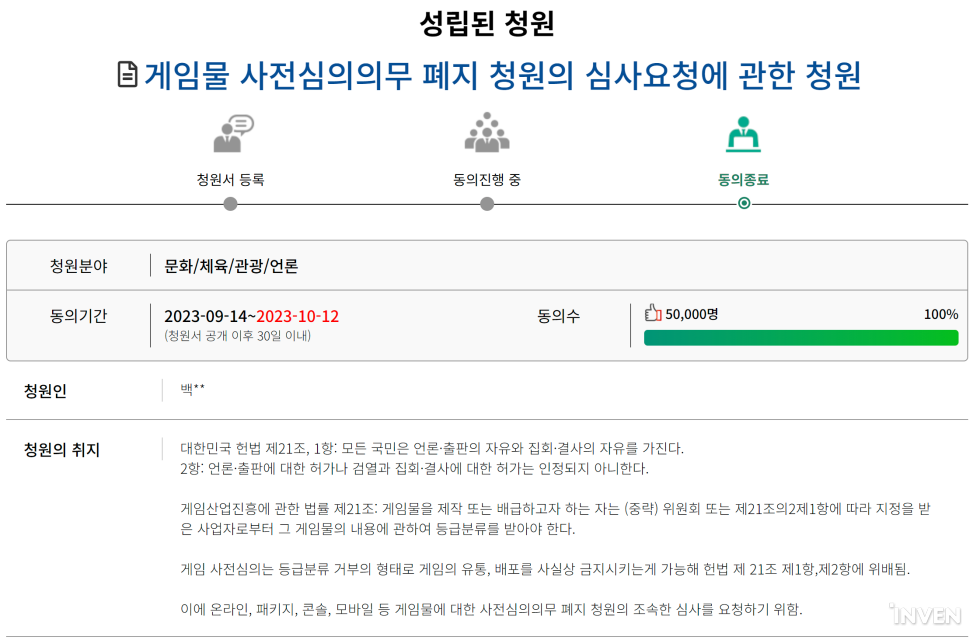 앞선 청원이 임기 만료에 따른 폐기 위기에 처하자 지난달 12일 유저들은 재청원을 실시했다. 이번 청원인은 “사전심의 의무를 폐지해달라는 청원이 회부 조건을 달성했었지만, 지금까지 아무런 논의 없이 심사 단계에 머물러 있다”라며 “국회가 조속히 청원을 심사해달라”고 요구했다.