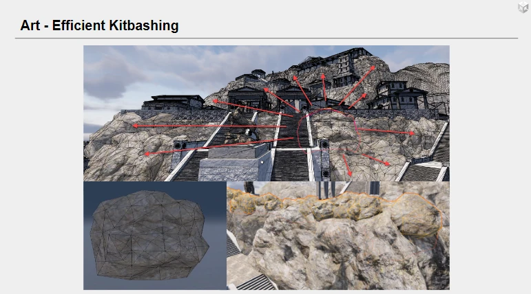이어 아트 구현에 활용된 메시 터레인(Mesh Terrain), 고저차(Altitude Differences), 키트배싱(Kitbashing), 어셋과 가이드라인이 500m x 500m 규모의 빅월드를 표현하는 과정에서 어떤식으로 사용됐는지 실제 사례들과 함께 소개됐다.