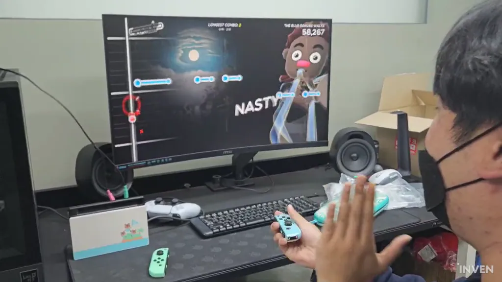 이후 위치를 조정한 다음 날라오는 노트를 향해 L 또는 R 버튼을 누르면 캐릭터가 트롬본을 부는 모습을 볼 수 있습니다. 그러면 계속 버튼을 누르고 있으면 되는 거 아니냐고요? 그렇게 되면 화면 왼쪽 위에 있는 콤보 게이지가 쌓이지 않아 높은 점수를 받을 수 없습니다. 무엇보다도 캐릭터가 숨이 차서 연주를 못 하더라고요.