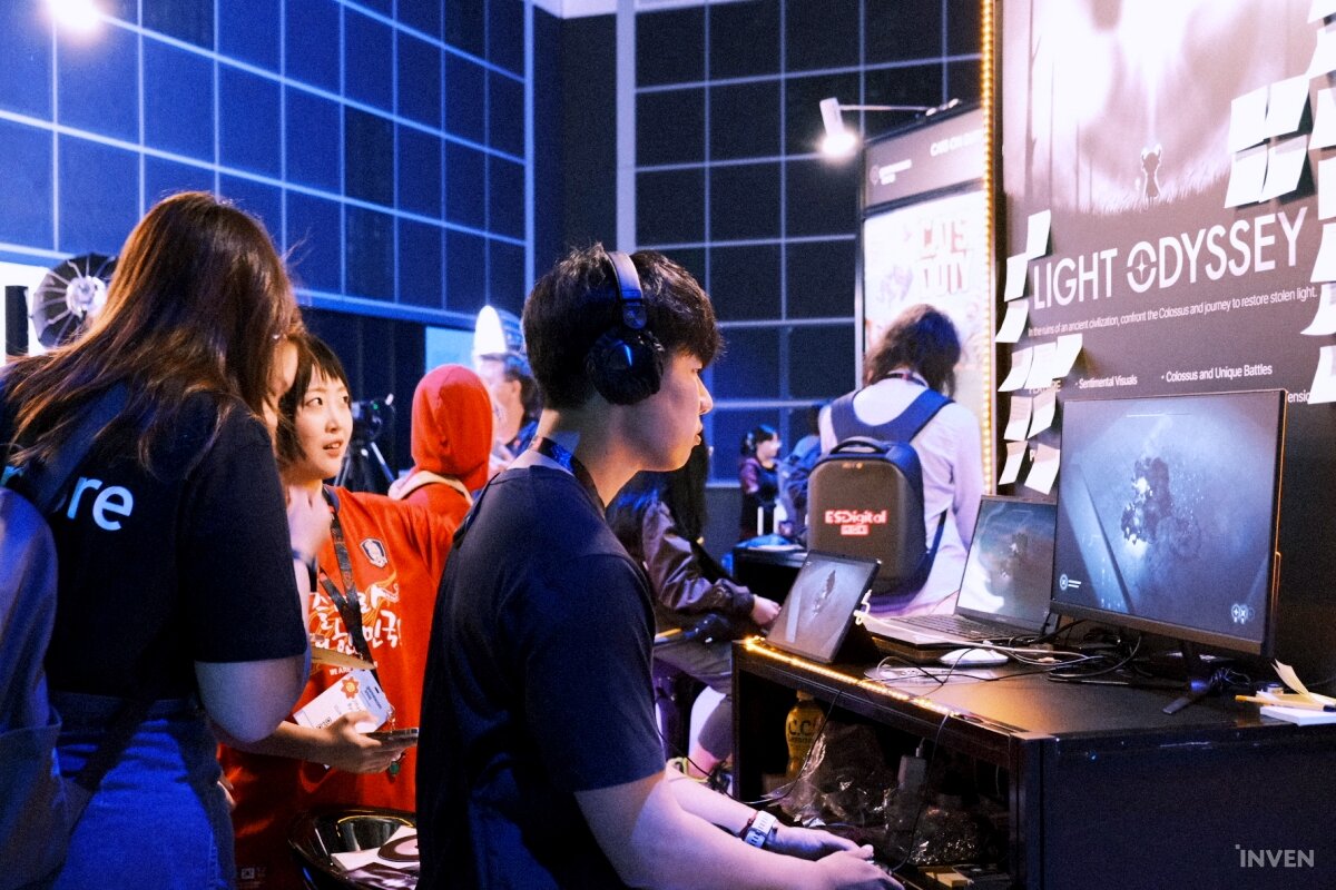 완다와 거상, 다크소울 등의 게임에서 영감을 얻은 탑다운 액션 게임 ‘라이트 오디세이’를 개발중인 썬 게임즈는 팀원 모두가 ‘붉은 악마’ 응원 셔츠를 입고 부스에 등장해 눈길을 끌었습니다. 바로 ‘오 한국 사람!’이라고 확인할 수 있었죠. 게임은 내년 6월 얼리액세스를 목표로 열심히 개발중입니다.