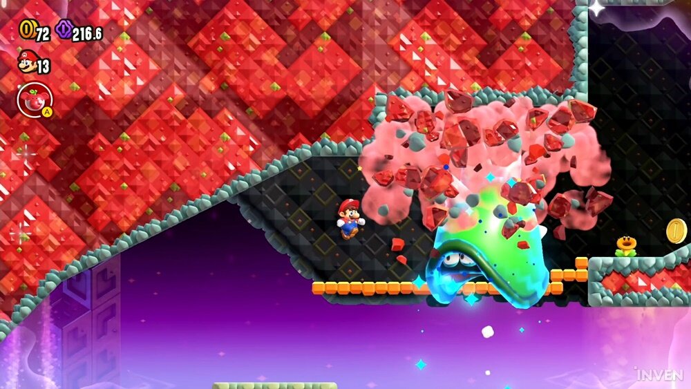 이는 크게 2가지 측면에서 긍정적인 변화를 가져옵니다. 첫 번째는 스테이지의 확장, 그리고 기믹의 추가입니다. 하나의 스테이지를 전혀 다른 방식으로 즐길 수 있도록 한 것이죠. 물론 단순히 스테이지를 넓힐 뿐인 확장이었다면 그다지 좋은 평가를 내릴 수 없었을 겁니다. 하지만 ‘슈퍼 마리오 원더’는 여기에 더해 예상치 못한 각종 기믹을 추가함으로써 신선한 즐거움을 선사했습니다. 함정을 애벌레처럼 꿈틀거리는 토관을 타고 안전하게 건넌다거나 슬라임으로 변해서 좁은 틈을 지나가거나 하는 식이죠.
