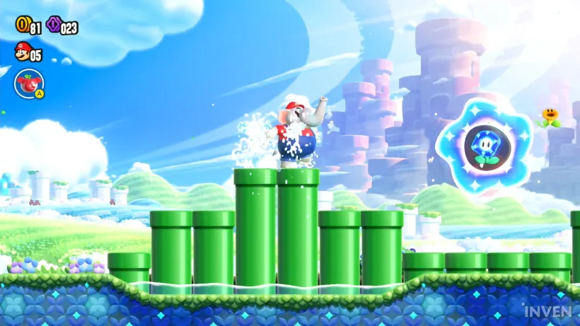 그렇다고 모든 재미의 방점이 원더플라워에만 맞춰져 있다는 건 아닙니다. 손뼉이 맞아야 소리가 난다는 속담처럼, ‘슈퍼 마리오 원더’는 횡스크롤 플랫포머 시리즈의 근본적인 재미 역시 간과하지 않았습니다. 스테이지를 클리어하는 과정 그 자체로도 재미를 보장해야 한다는 얘기로, 원더플라워로 인한 예측 불가능한 변화가 색다른 재미를 선사한다면, 새롭게 추가된 변신과 배지 등은 기존의 시스템을 확장함으로써 익숙한 재미를 선사합니다.