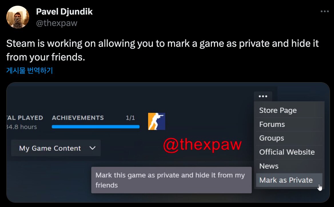 비공식 스팀 데이터베이스 사이트 스팀DB의 개발자 파벨 듄디크는 현지 시각으로 8일 자신의 X(구 트위터)를 통해 스팀의 신규 기능을 소개했다. 해당 기능은 개별 게임을 친구들이 확인할 수 없도록 숨기는 기능이다.
